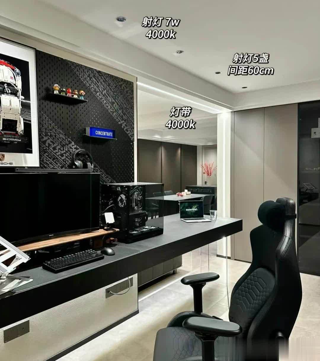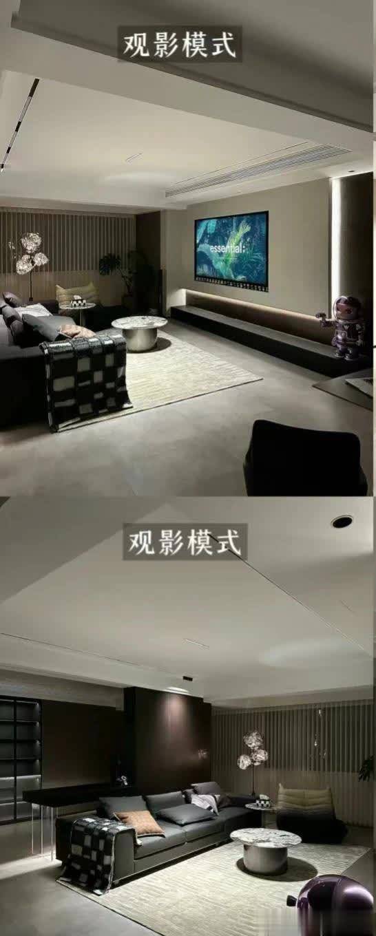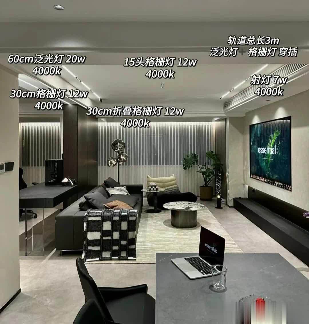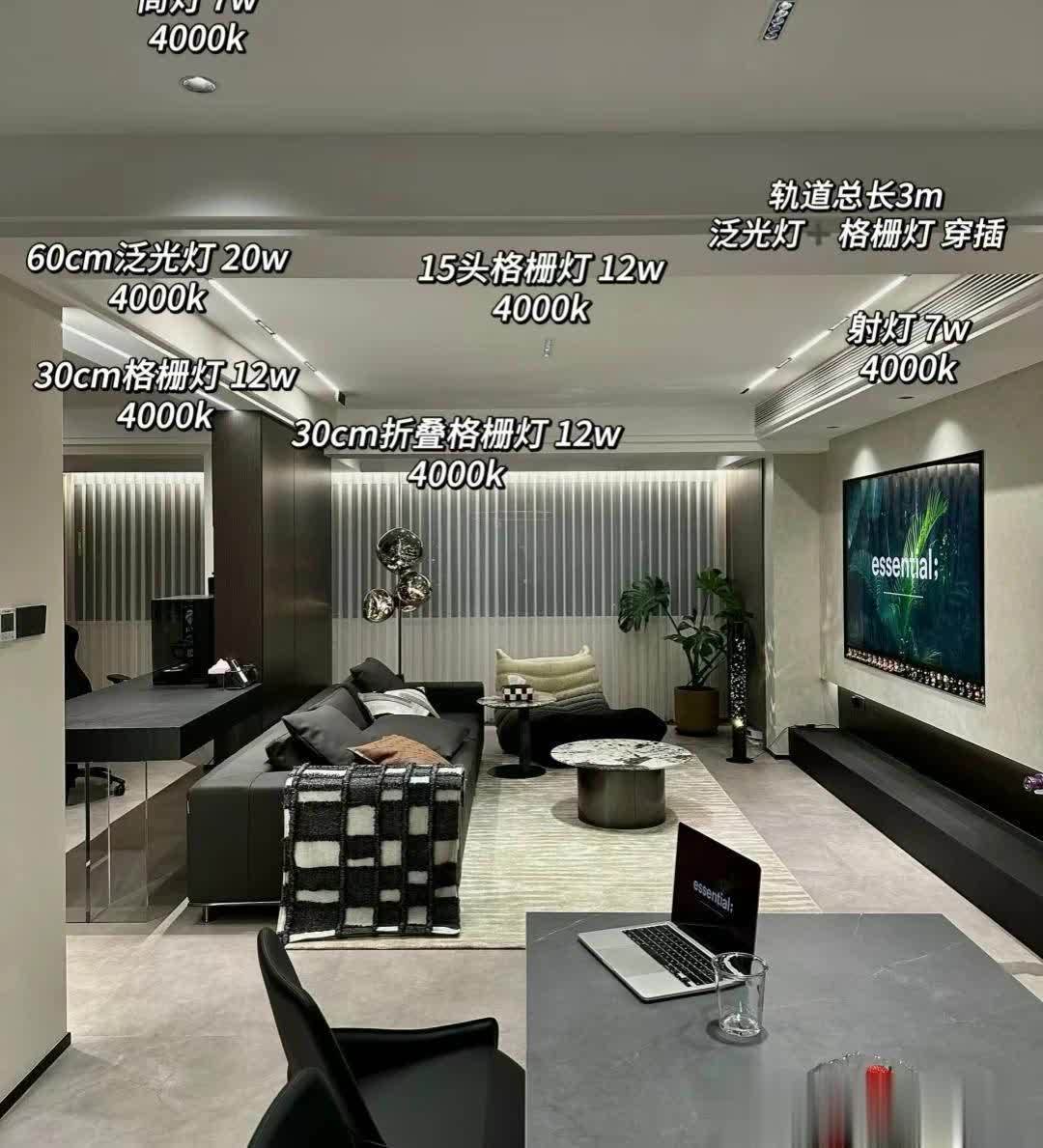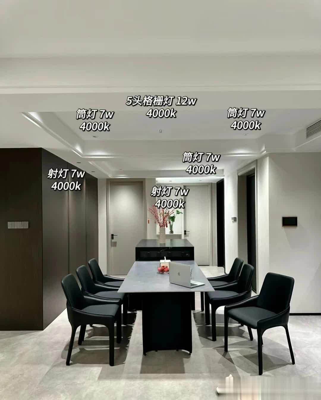 客厅区域沙发选择黑色直排沙发,靠阳台区域搭配浅色单人沙发!圆形茶几更为合适,客厅坚持无主灯设计!非常恰当,射灯➕磁吸轨道灯,吊完顶后,层高还剩2.63米。