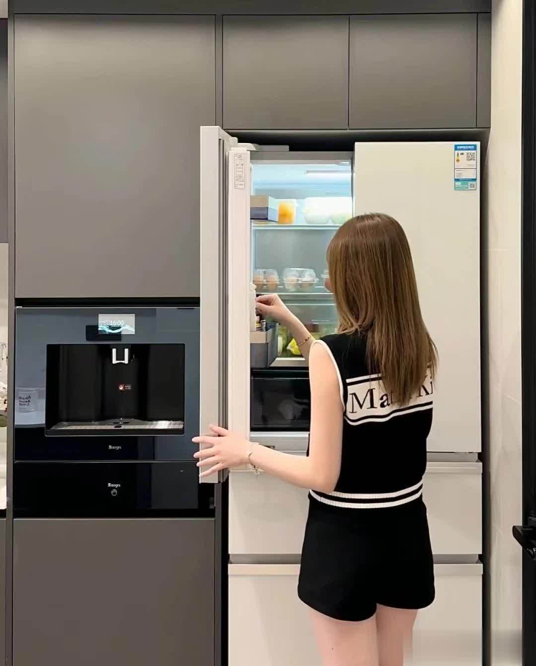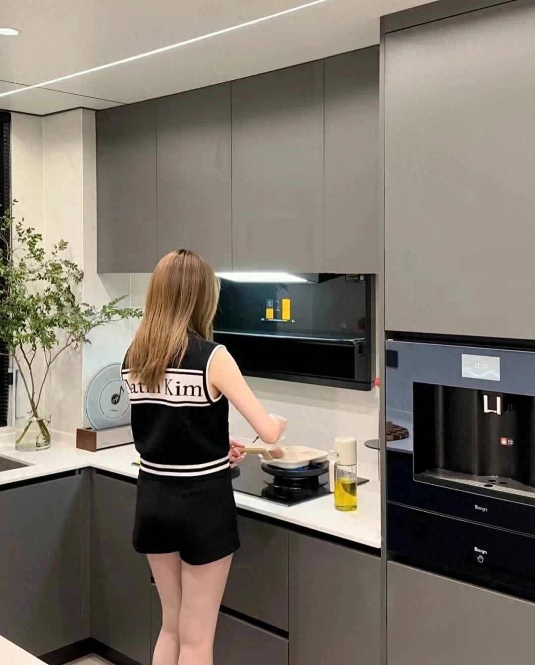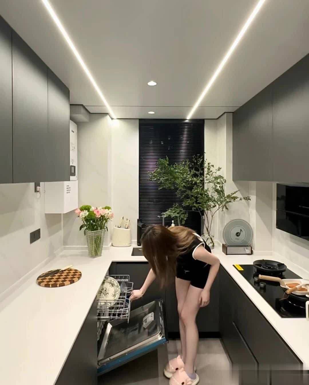 厨房空间6个平方,采用U型布局,橱柜柜门为平板门,特意选的深灰色,看重其耐脏性!台面是石英石台面,水槽靠窗户设计。冰箱选择内嵌式设计。