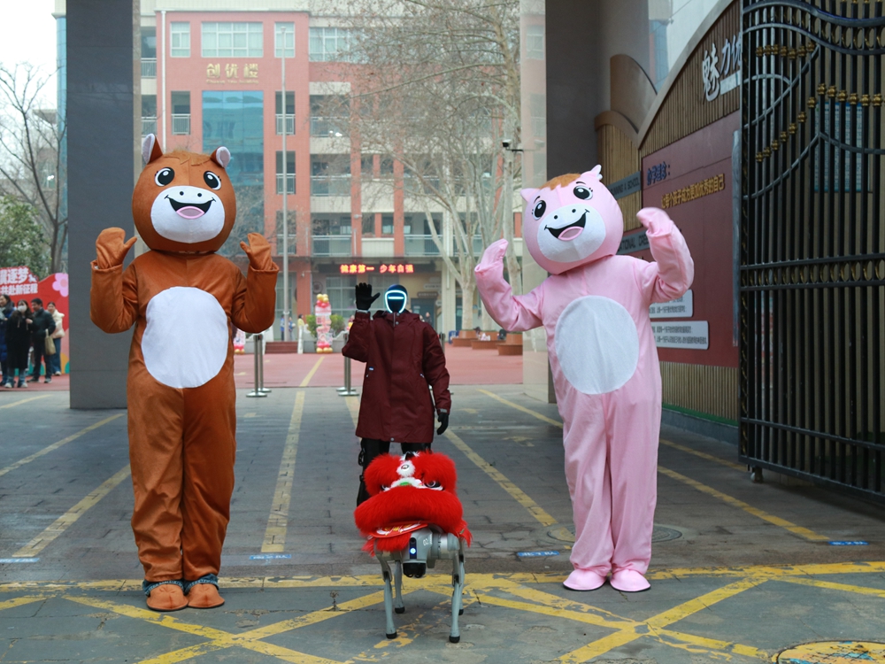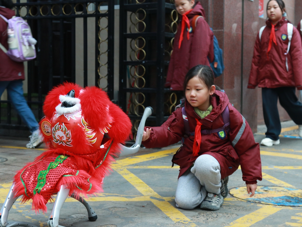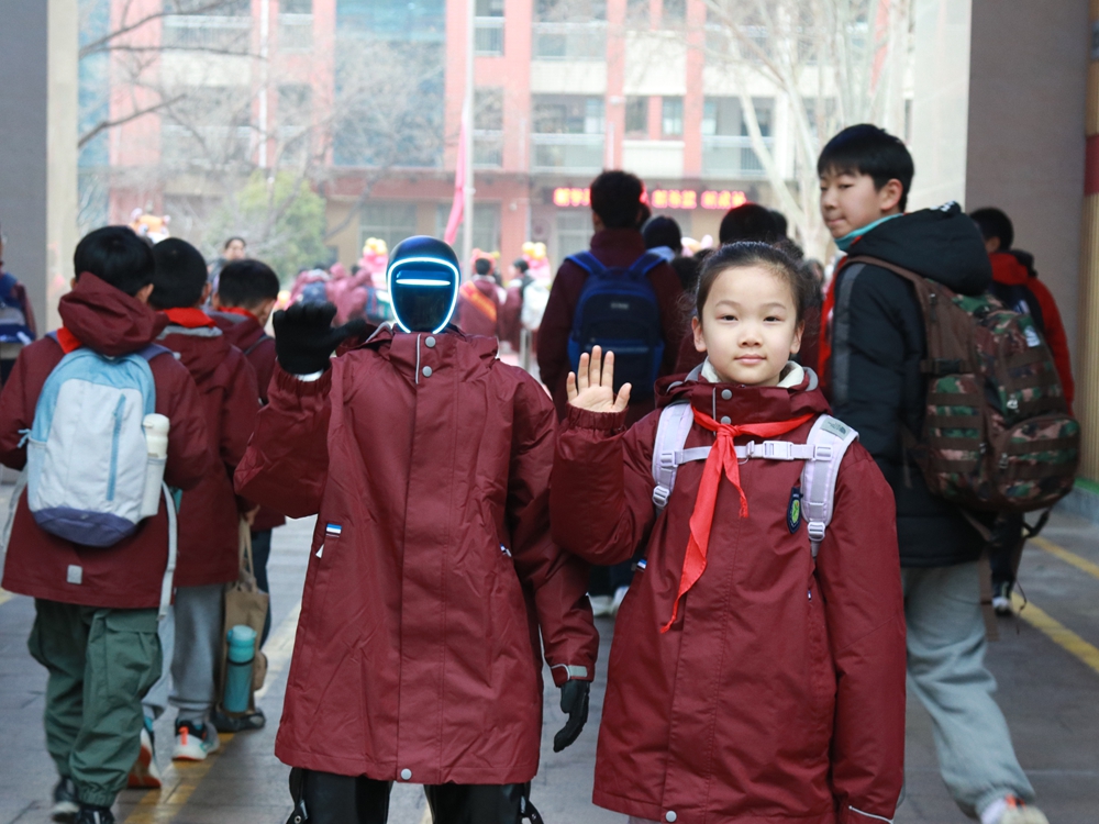 升旗仪式后,春晚同款机器人惊艳登场,灵动复刻舞台风采之余,更与现场队员展开趣味互动。科技感十足的表演,将“骐骥逐梦”的内涵与未来科创元素巧妙串联,让孩子们在新奇体验中触摸科技脉动。