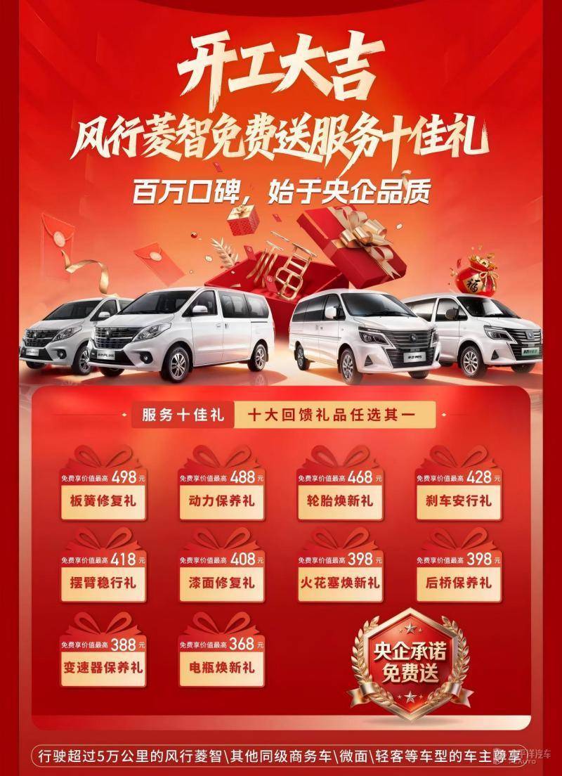 下订菱智系列至高可获8888元购车红包。此外,东风风行官方面向行驶超5万公里的菱智及同级商务车、微面、轻客等车型车主推出服务十佳礼,包括动力保养、轮胎换新、漆面修复、变速箱保养、电瓶换新等实用服务。