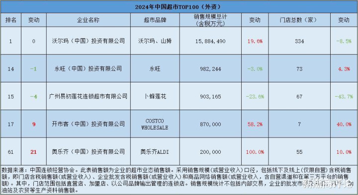 中国连锁经营协会(CCFA)发布的《2024年中国超市TOP100》,是观察中国超市行业的重要窗口。去年,上榜的100家企业销售总额同比增长0.3%至9002.03亿元;门店总数为2.52万家,同比下降9.8%。外资品牌的表现如何?
