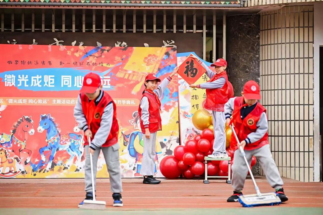 传承的最好方式是践行。“社区议事厅”情景剧展现了“红益+”志愿团队的默默奉献,“城市守护者”实践缩影让公益的星火被看见、被传递。“爸爸思政团”家长代表以“崇德向善”“正德明志”“明德惟馨”三个维度为不同年级的学生搭建美德成长阶梯。全校同学手持“美德种子班”认证牌如林挥舞,微光成炬。六年级同学带来的“未来学校蓝图”创意走秀、“天空教室”“生态循环校园”“AI智慧学习伙伴”等创意构想展示将活动推向高潮。孩子们不再是知识的被动接受者,而是未来学校的共创者。伴随着五彩气球腾空而起,孩子们的梦想也随之飞向广阔天空。